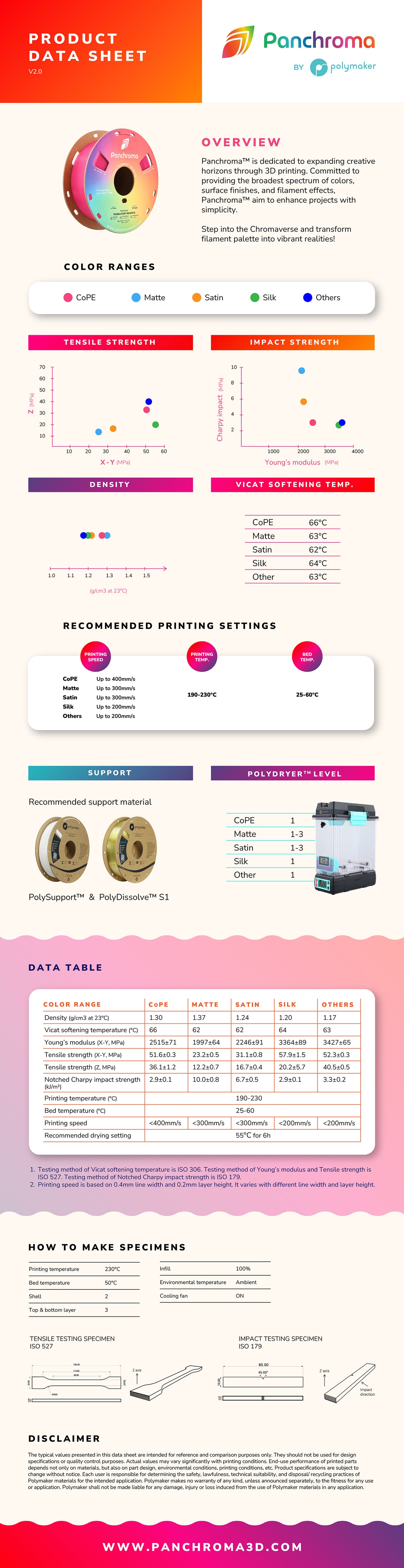 Panchroma™ is a new family of engineered polymer compounds containing PLA. The formulations are fine tuned for each color/surface finish to offer the best aesthetic quality and printability. They can be reliably printed on any FFF/FDM 3D printer under typical PLA settings.