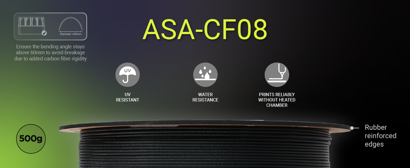 ASA-CF08 supports high-speed printing up to 350 mm/s, is less prone to warping and requires minimal chamber heating, making it a versatile choice for both professionals and hobbyists.