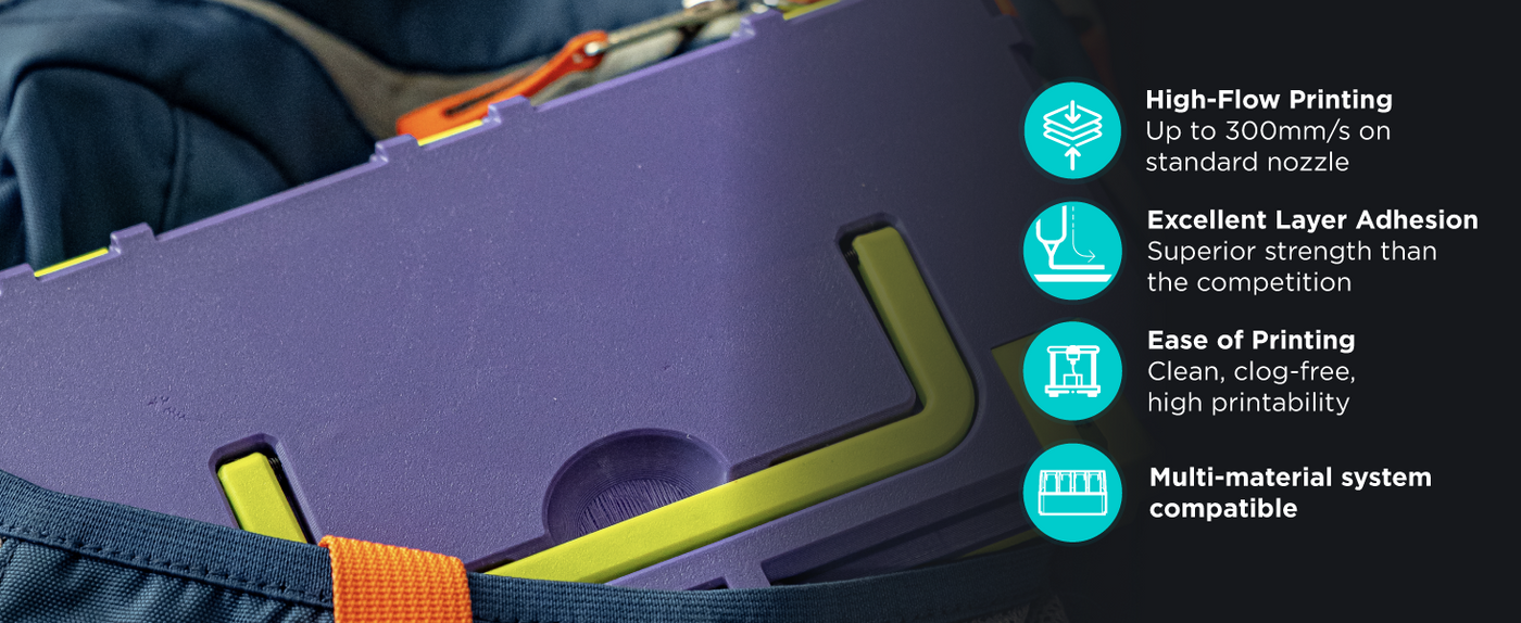Engineered to print faster without losing strength or quality. Its high-flow formulation enables clean, accurate extrusion at speeds up to 300 mm/s, or over 500mm/s with high-flow nozzles while maintaining excellent layer adhesion, durability and surface finish.
